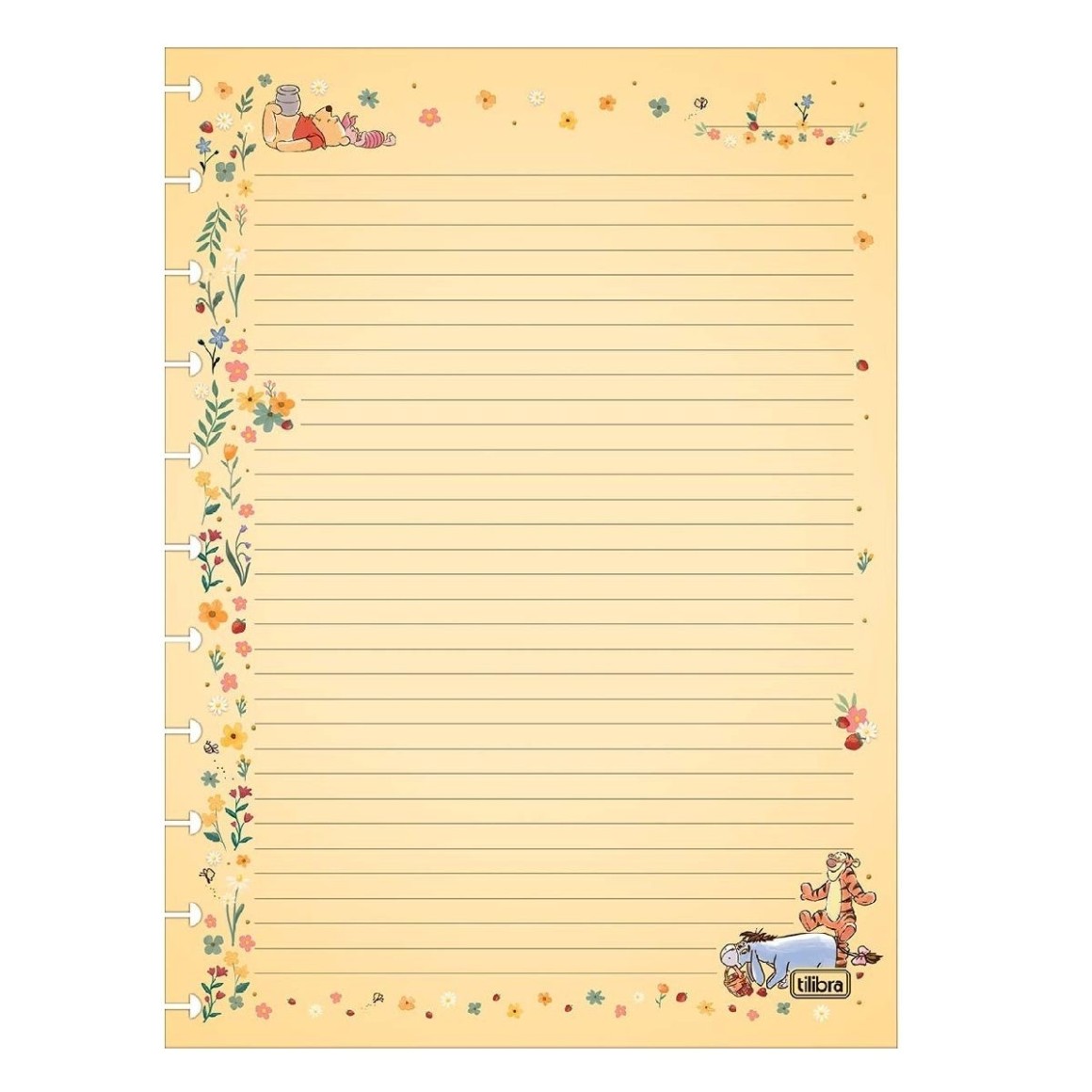 O Refil para Tilidisco Universitário Pautado Pooh 50 Folhas tem gramatura de 90 g/m² para facilitar o encaixe dos discos e oferecer mais possibilidades de escrita com diversos tipos de canetas. O produto possui furação para 11 discos e folhas decoradas