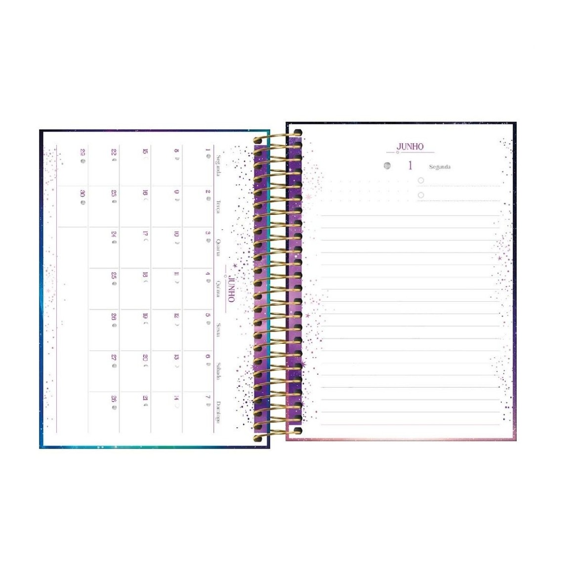 O produto tem tamanho 11,7 x 16,4 cm, capa dura com detalhes metalizados, bolsa de papel, adesivos e folhas com visão de 1 dia por página, exceto aos sábados e domingos.