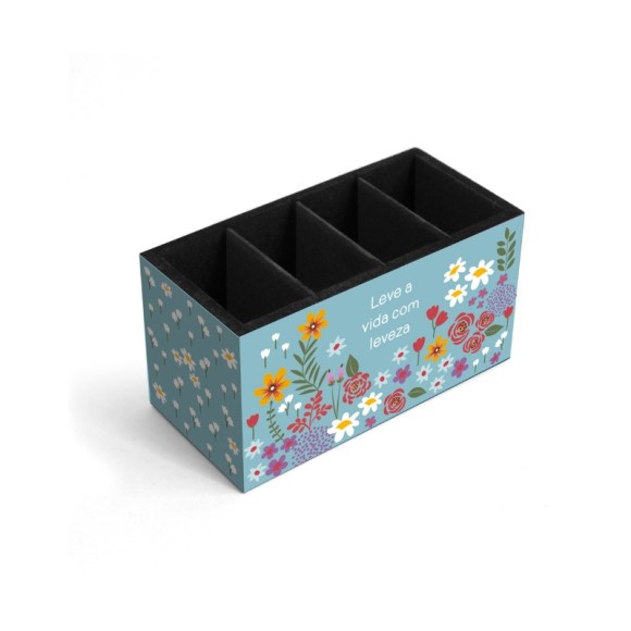 Porta-treco em MDF revestido para guardar o que quiser: lápis, canetas, tesouras, controle remoto e o que mais você imaginar. A parte interna é dividida em 4 espaços e é finalizada em material aveludado. Medidas: 17 comp. X 8,5 larg. X 9,0 cm alt.