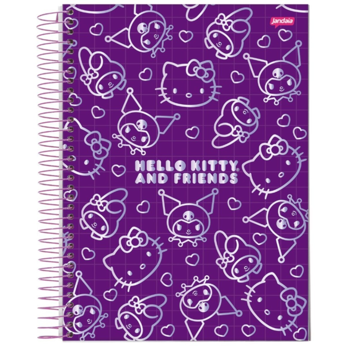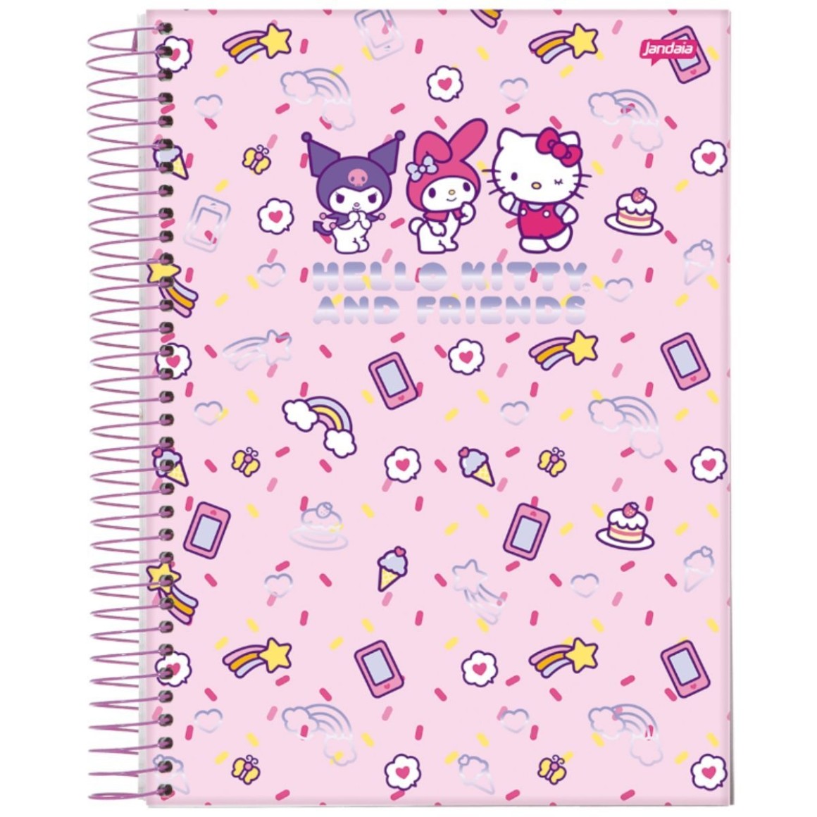 Hello Kitty, My Melody e Kuromi celebram a amizade com estilo e personalidade. Com acabamento em laminacao fosca e detalhes em Hot Stamping, as capas ganham um toque sofisticado sem perder a leveza e o encanto. A colecao traz quatro modelos vibrantes e modernos. Conta com pauta inteligente JandaIA, que ajuda a manter as anotacoes bem organizadas, alem de acessorios funcionais que completam a experiencia: Cartela de adesivos personalizada, Guarda decorado, Folha de planejamento, Etiquetas e bolsa de papel. Ideal para quem busca um caderno bonito, pratico e cheio de personalidade — perfeito para transformar a rotina de estudos com mais charme e alegria.