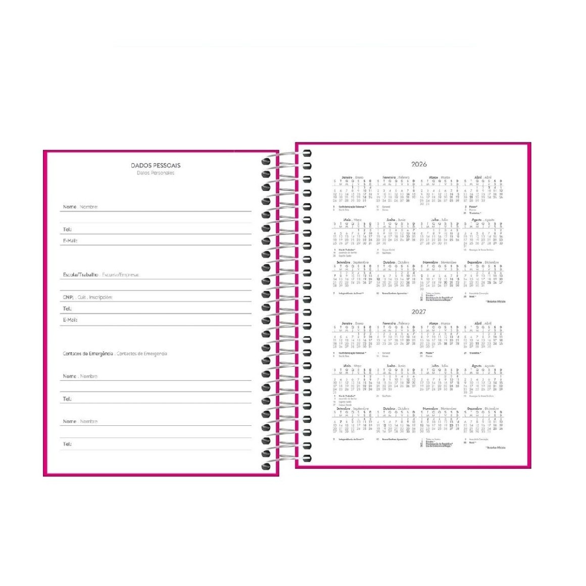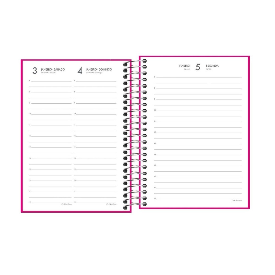 Agenda capa dura, espiralada com visão de 1 dia por página, exceto sábado e domingo. Ideal para a organização do dia a dia.