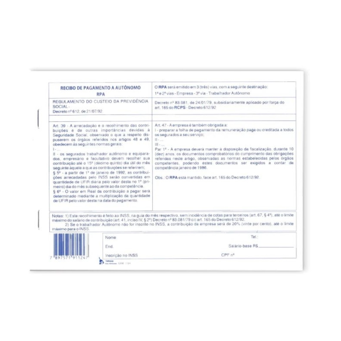 BLOCO DE RECIBO DE PAGAMENTO A AUTÔNOMO RPA 25X3 VIAS TAMOIO