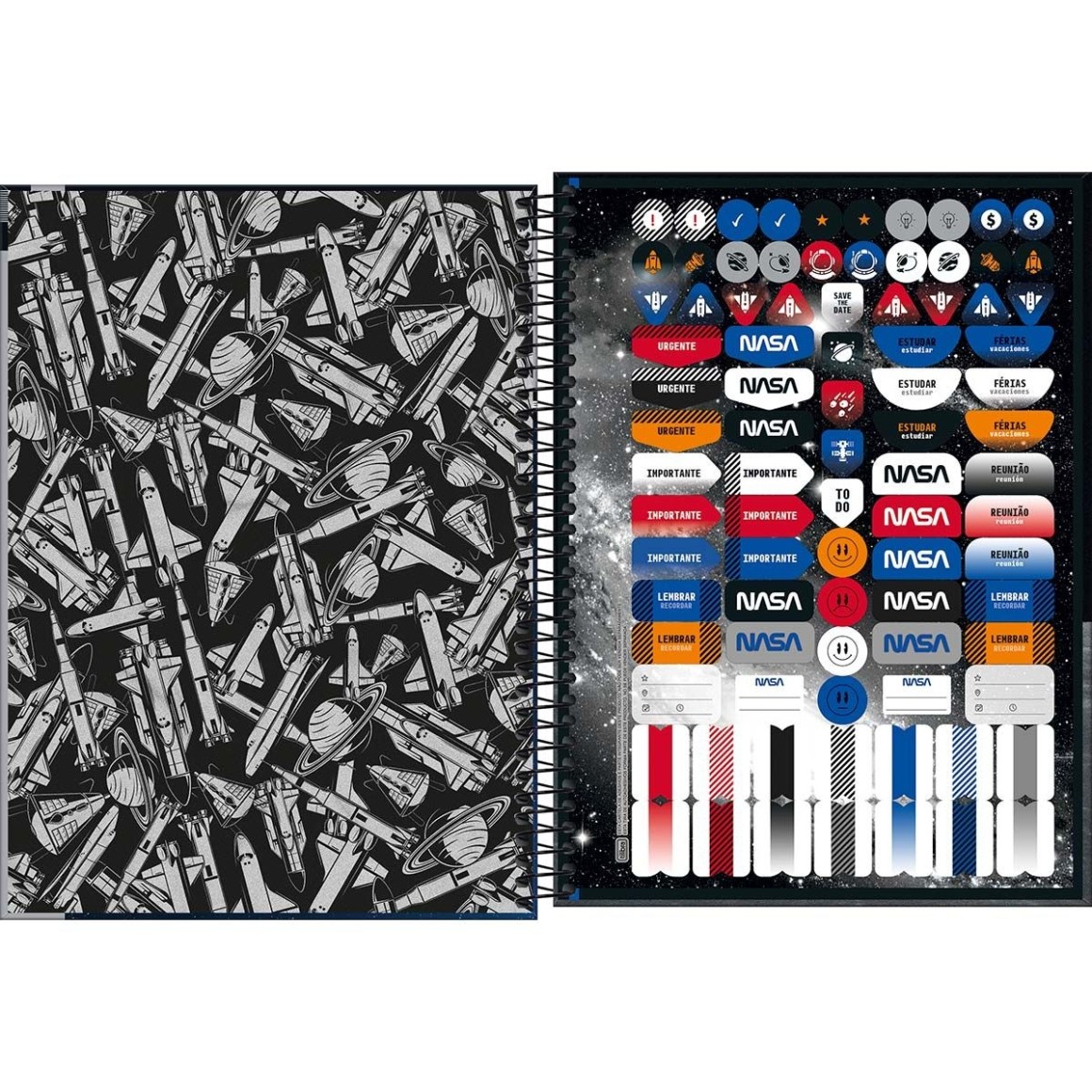 O Caderno Espiral Capa Dura Universitário 10 Matérias Nasa 160 Folhas possui capa dura com a parte interna decorada, bolsa plástica para guardar trabalhos e anotações, folha com adesivos funcionais, folhas pautadas e espiral colorido. Ideal para o dia a dia na escola ou na faculdade.