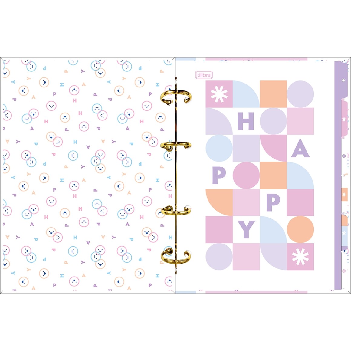 O Caderno Argolado Cartonado Colegial Happy 160 Folhas possui formato compacto, é leve e bastante funcional. Vem com capa dura com relevo e detalhe metalizado holográfico, parte interna decorada, divisórias decoradas, folha adesiva, folhas pautadas decoradas e bolsa plástica para guardar trabalhos e anotações.