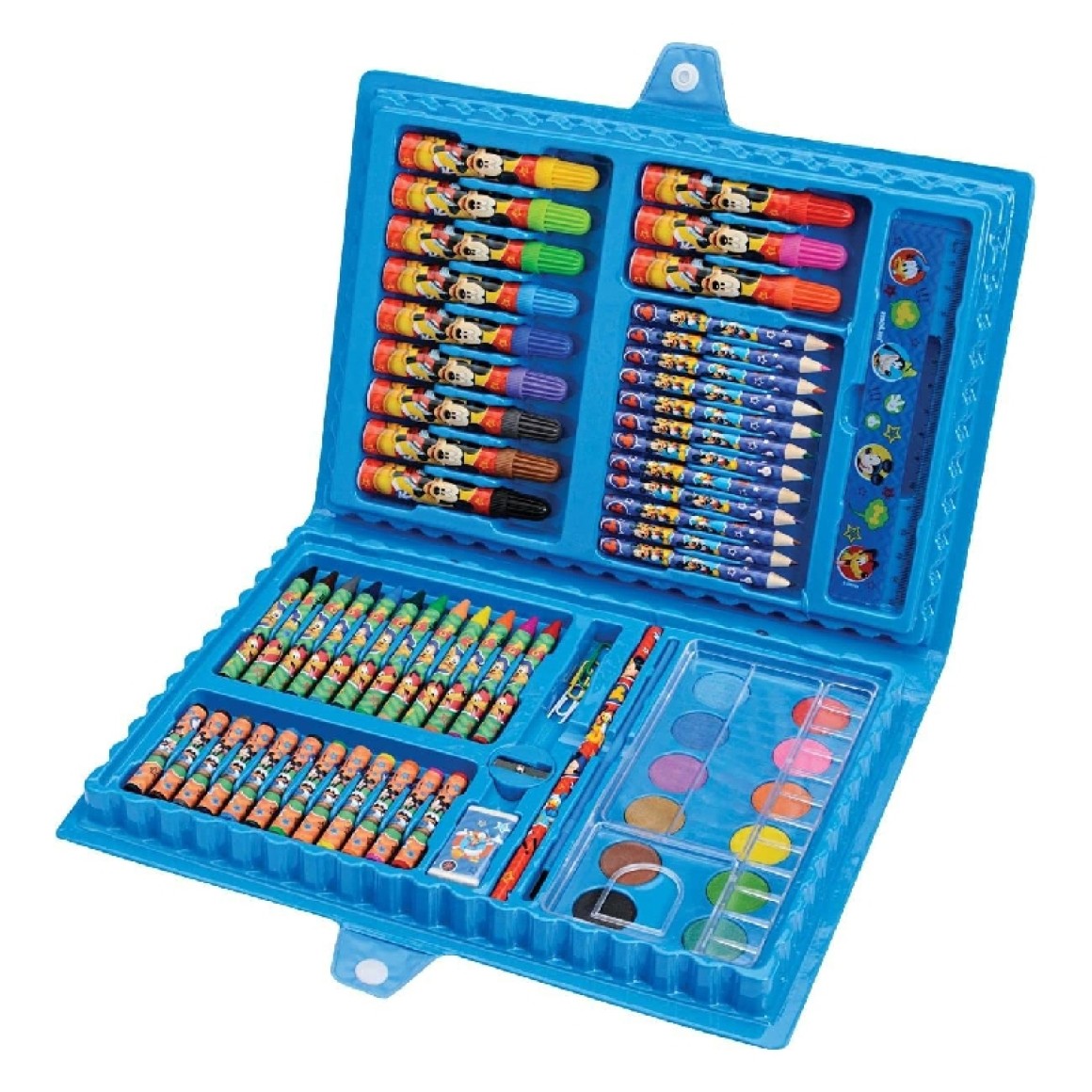Contém: 12 marcadores de colorir, 12 lápis de cor, 12 giz de cera, 12 giz pastel a óleo, 12 pastilhas aquareláveis, 1 cola, 1 régua, 1 lápis preto HB n° 2, 1 paleta, 4 folhas para colorir, 1 borracha, 1 apontador, 1 pincel.
